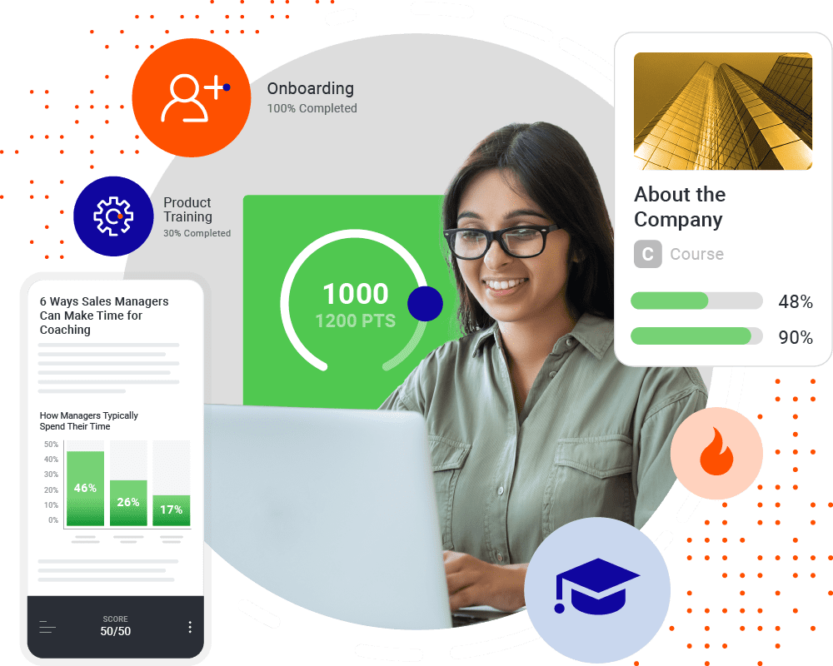 Enablement needs don’t stop once salespeople are in the field selling. They need quick access to content and training to prepare for sales interactions. Provide just-in-time training and content, microlearning, call recording snippets, reinforcement games, role-play exercises and more.