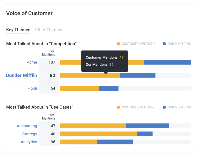 Analyze the voice of your customer with custom reports and dashboards. View frequent themes and topics, like which competitors customers mention — and how often.