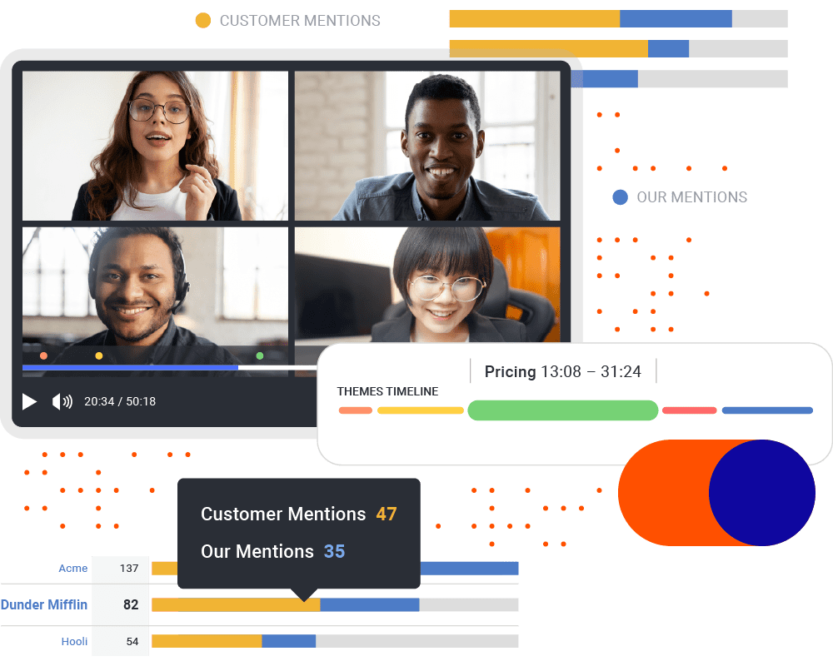 Record, transcribe, and analyze every customer conversation with our Call AI conversation intelligence technology. With AI-created conversation summaries, you’ll have actionable data on your customers biggest pain points and objections, as well as insight into your top competitors, use cases, and trends — use this data to create actionable voice of the customer programs.